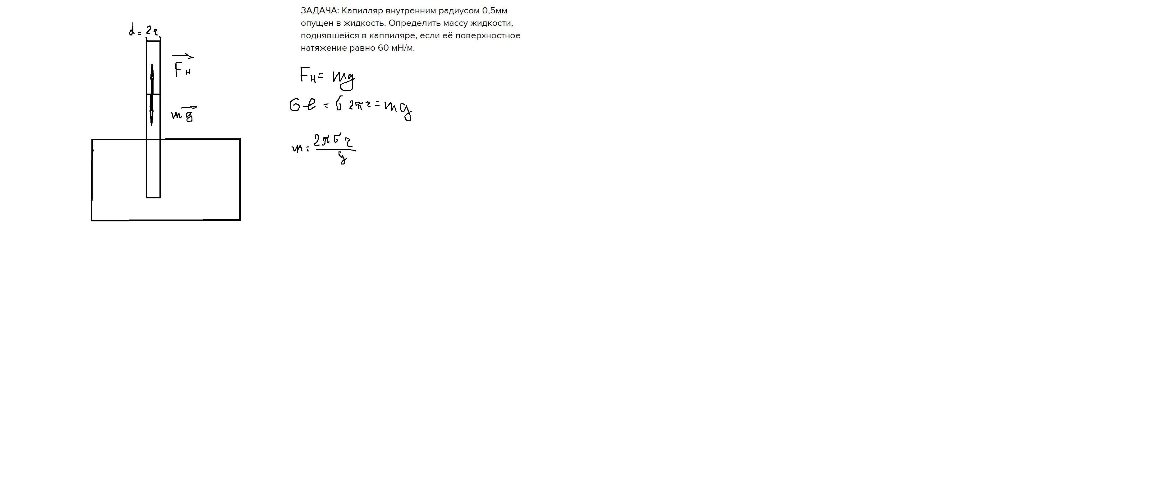 ЗАДАЧА: Капилляр внутренним радиусом 0,5мм опущен в жидкость. Определить массу жидкости, поднявшейся в каппиляре, если её поверхностное натяжение равно 60 мН/м.