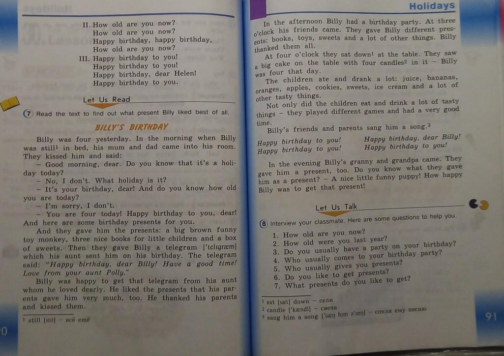 Билли исполнилось 4 вчера. Утром, когда Билли все еще спал(лежал в кровати), его мама и папа вошли в комнату. Они поцеловали его и сказали: –Доброе утро, дорогой. Ты знаешь какой сегодня праздник? –Нет, не знаю. Какой сегодня праздник? –Твое день рождение, дорогой! А знаешь сколько тебе лет сегодня? –Мне жаль, я не знаю. –Тебе четыре года сегодня! С днем рождения тебя, дорогой! А это тебе небольшие подарки. Они дали ему подарки: большую коричневую смешную игрушку обезьянку, три хороших книжки для детей и коробку конфет. Затем они дали ему телеграмму, которую его тетя отправила на его день рождение. В телеграмме написано :«С днем рождения, дорогой Билли! Хорошо провести тебе время! С любовью от твоей тети (имя не разберу). Билли обрадовался телеграмме от тети, которую он очень нежно любил(). Он также любил и подарки, которые дарили ему его родители. Он поблагодарил своих родителей и поцеловал их. После полудня ему устроили праздник(вечеринка,пати). Его друзья пришли в 3 часа. Они подарили ему разные подарки: книги, игрушки, конфеты и много других вещей. Билли поблагодарил их всех. В четыре часа они сели за стол. Они увидели большой торт на столе с четырьмя свечами в нем-Билли исполнилось четыре в этот день. Дети ели и пили много: сок, бананы, апельсины, яблоки, печенье, конфеты, мороженое и много разных вкусных блюд. Но дети не только пили и ели много вкусных блюд- они еще играли в разные игры и хорошо провели время. Друзья Билли и его родители спели ему песню. «С днем рожденья тебя! С днем рожденья тебя! С днем рожденья, дорогой Билли! С днем рожденья тебя! Вечером пришли дедушка и бабушка Билли. Они подарили ему подарки тоже. А знаете, что они ему подарили?–Хорошенького, маленького смешного щенка! Как же рад был этому подарку Билли!