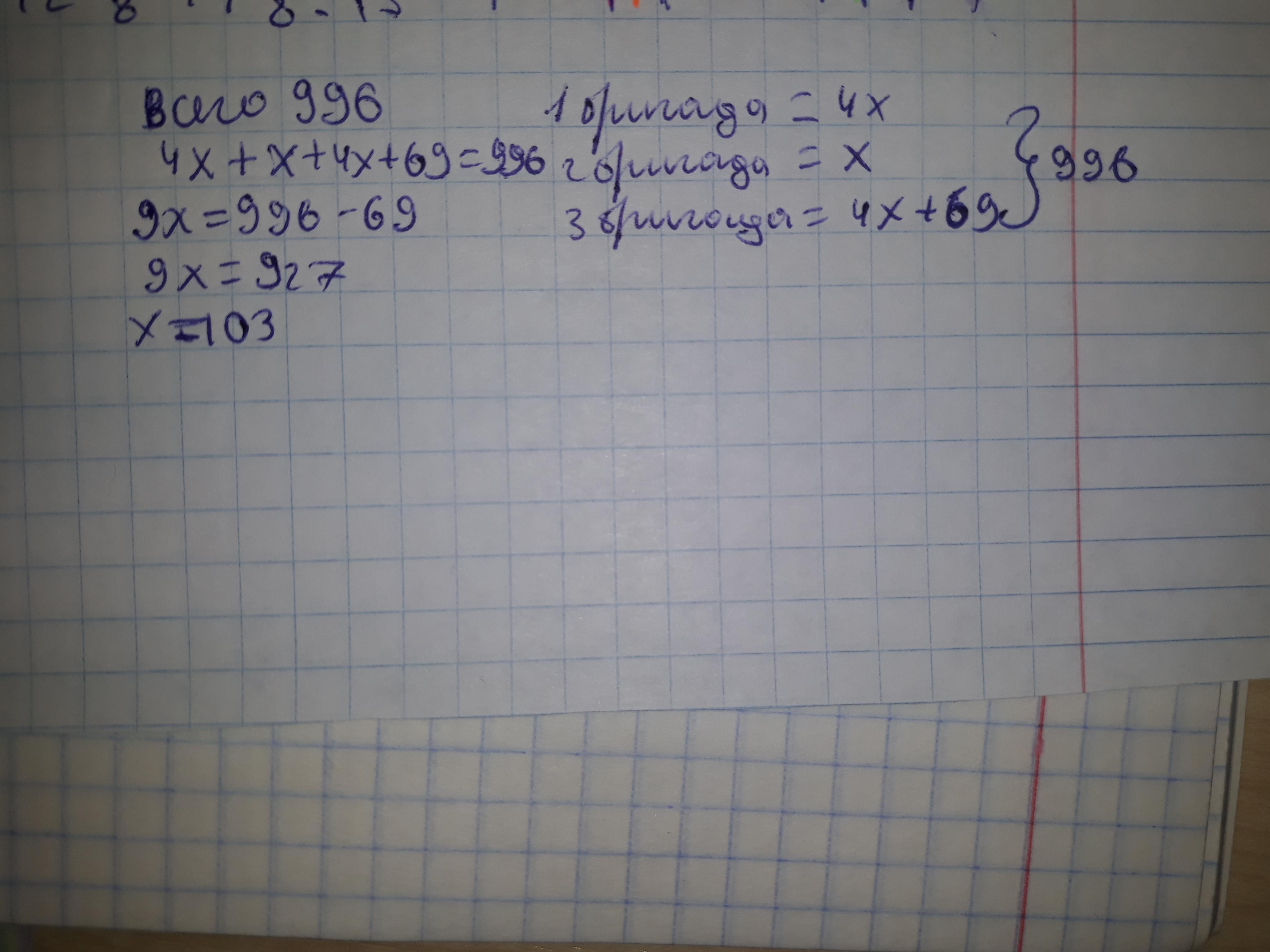 1) 996 - 69 = 927 (кг) - собрали бы, если бы третья собрала столько же сколько и первая (т.е. в 4 раза больше второй)