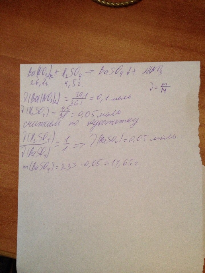 Вычислите массу осадка,который образовался при взаимодействии растворов,содержащих соответственно нитрат бария массой 26,1г и серную кислоту массу 4,5г. вычислите пожалуйста