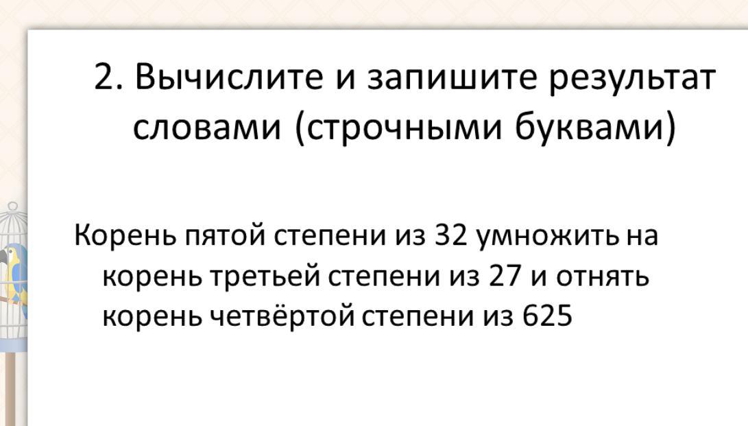 Ответ: ⁵√32=2, ∛27=3, ⁴√625=5. Тогда исходное выражение перепишем как 2*3-5=6-5=1. Ответ: единица.