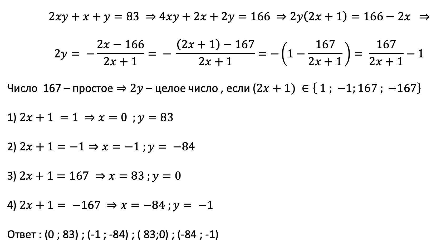 найти все целые числа x и y, для которых выполняется равенство 2xy+x+y=83.