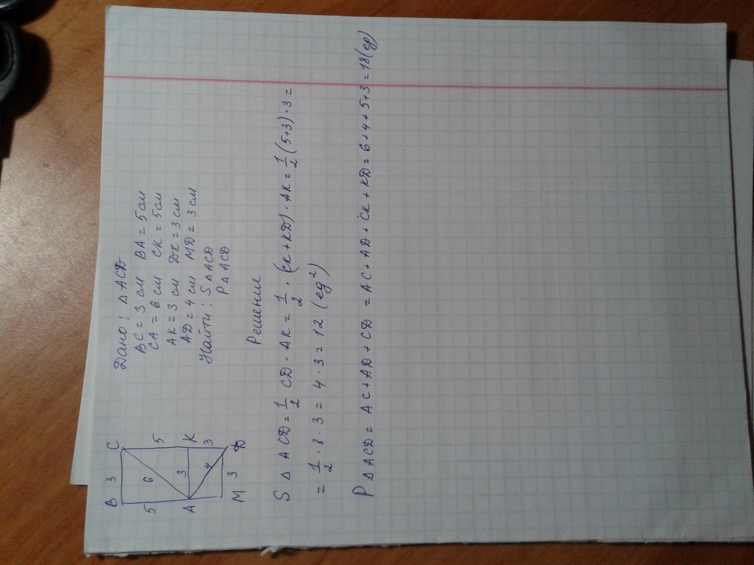Найди площадь и периметр треугольника ACD, BC=3см, BA=5см, CA=6см, CK=5см, AK=3см, DK=3см, АD=4см, AM=3см,MD=3cм