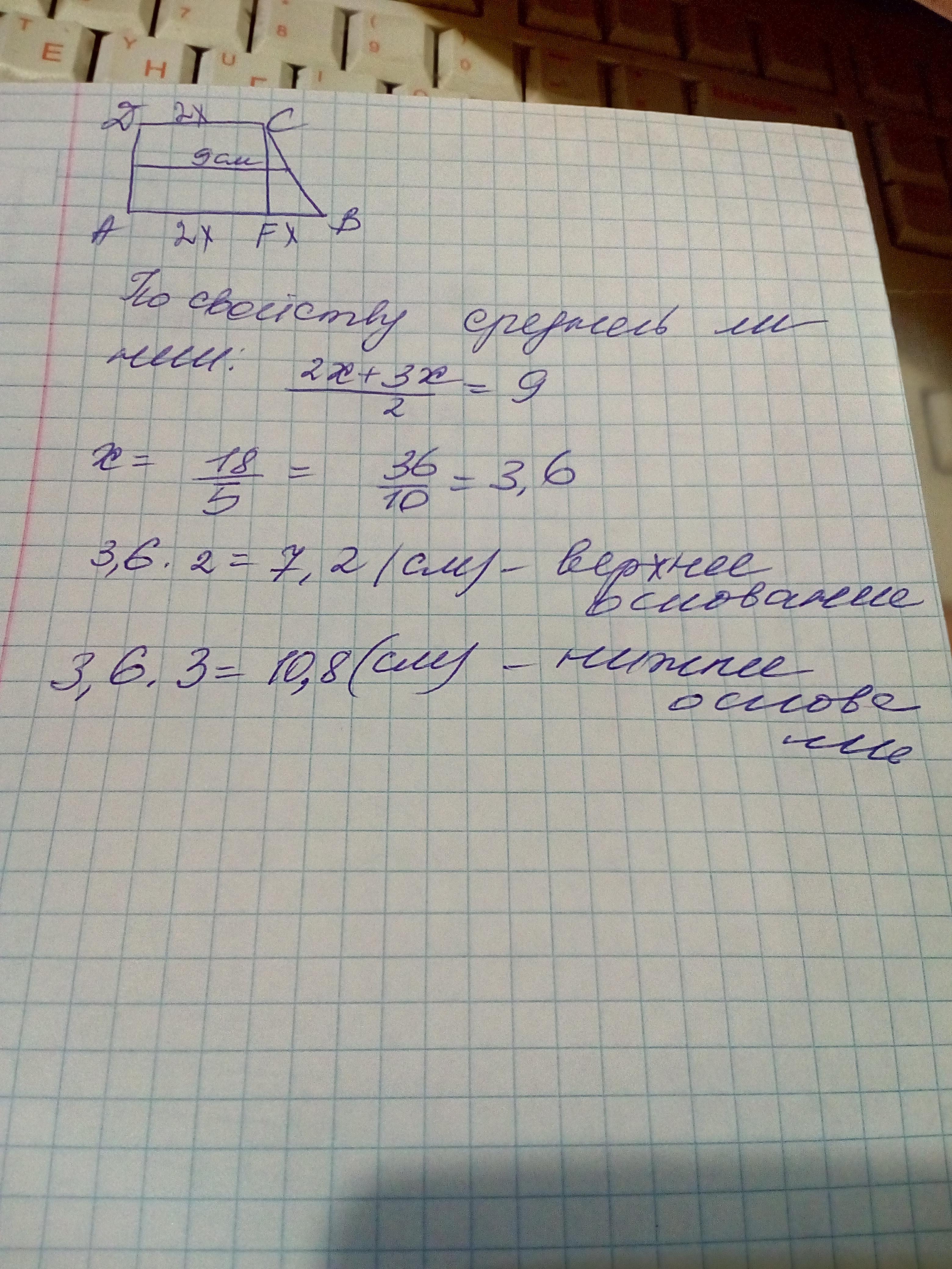 Середня лінія прямокутної трапеції дорівнює 9 см, а висота, проведена з вершини тупого кута, ділить більшу основу на відрізки, один з яких у 2 рази більший за другий, рахуючи від вершини прямого кута. Знайдіть основи трапеції. ДАЮ 50 БАЛІВ!!!