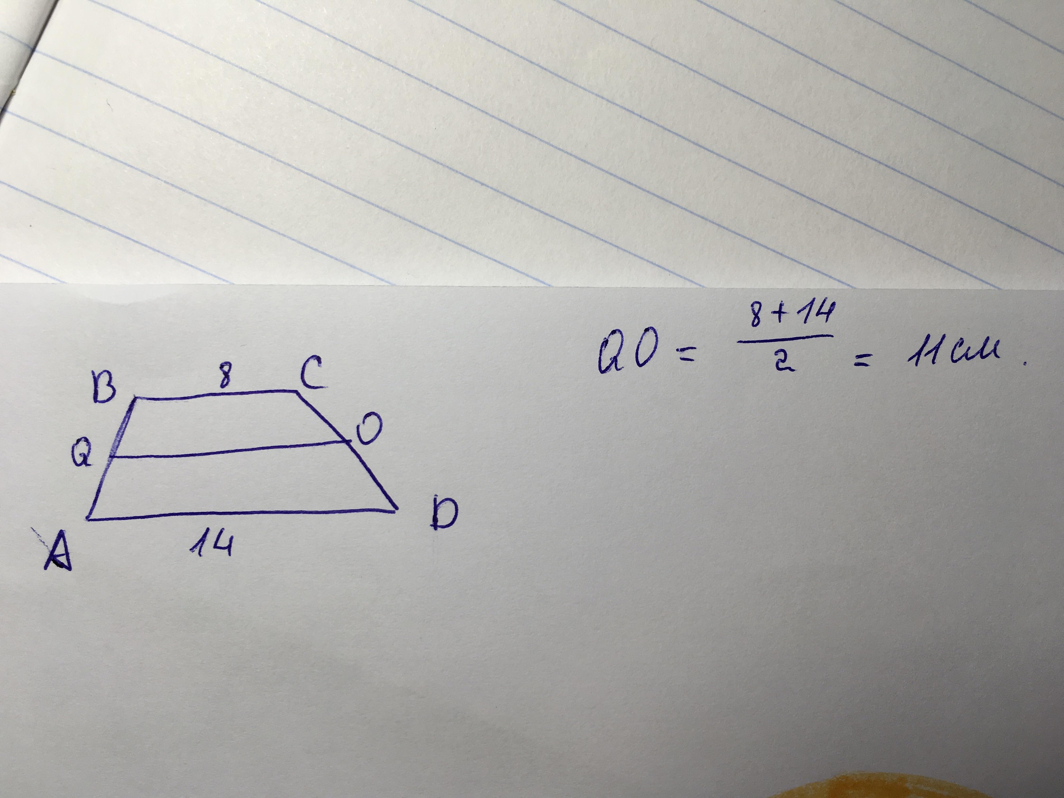 средняя линия равна полусумме основааний, т.е. (8+14)/2=11(см)