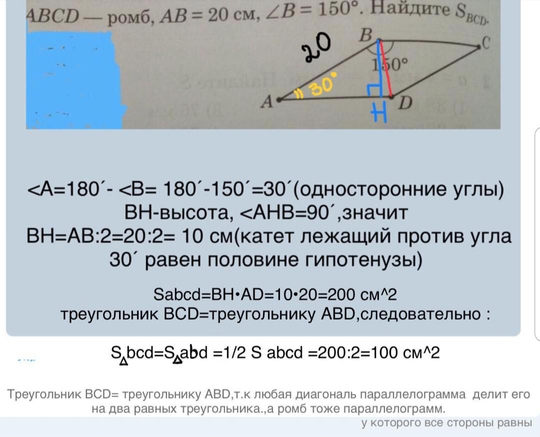 S треугольника ВСD=S треугольника АВD= 1/2 S ромба АВСD= 200:2=100cм^2
