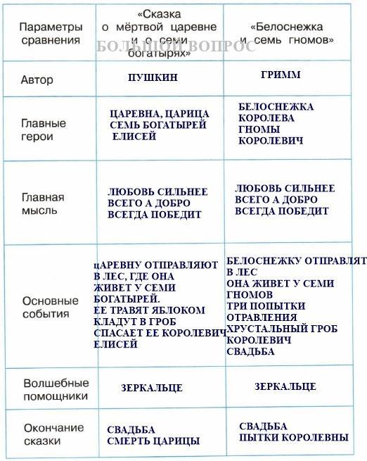 Сравнить сказки белоснежка и семь гномов, сказка о мертвой Царевне и еще одну с таким же сюжетом, заполнить таблицу.