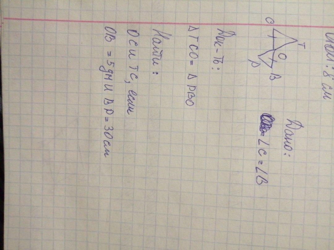 2)В равных треугольниках соответственные элементы равны, значит ОС-ВО=5 дц, ТС=ВР=30см=3 дц