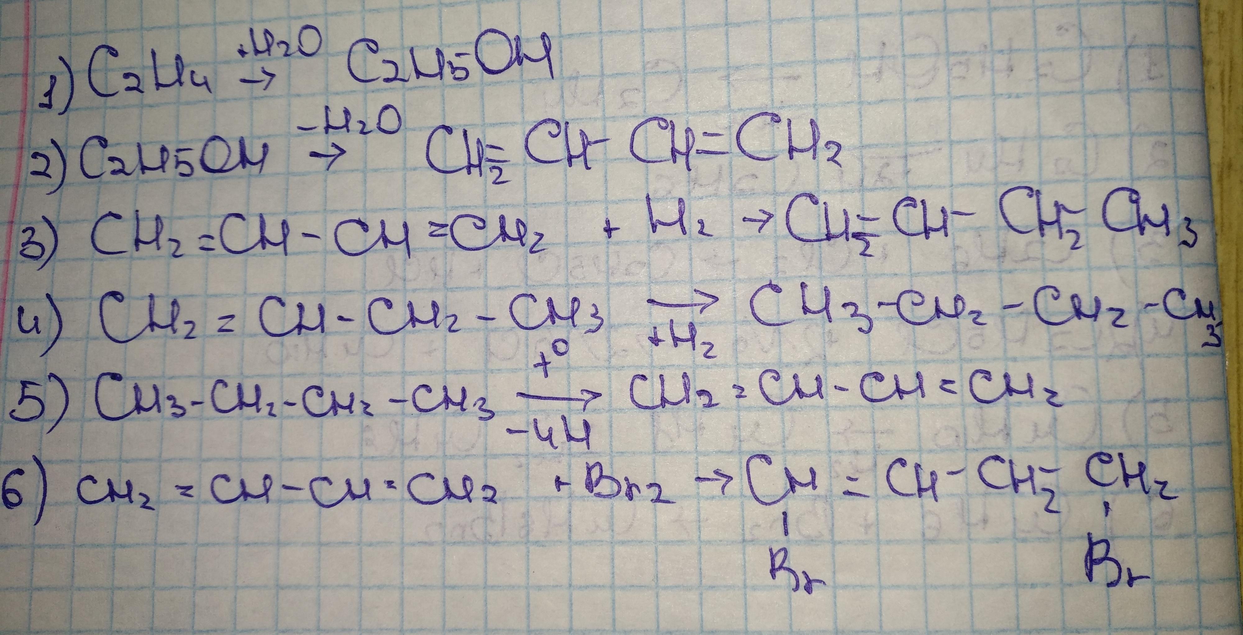 С2Н4 -> С2Н5ОН -> С4Н8 -> С4Н8 -> С4Н10 -> С4Н8 -> С4Н8Br2