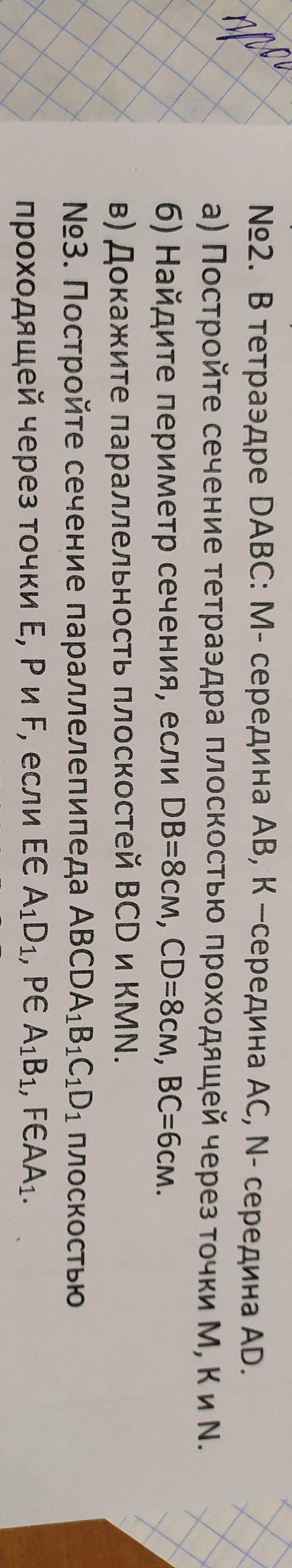 На грани ABD расположены две точки искомого сечения - т.А и т.М. Соединив их, получим линию пересечения грани и плоскости сечения. Так как плоскость сечения должна быть параллельна прямой ВС, то линия пересечения плоскости сечения и плоскости грани BDC будут параллельны. Определение: Прямая и плоскость называются параллельными, если они не имеют общих точек. По теореме: . Если прямая (ВС), не лежащая в данной плоскости (сечения), параллельна какой-нибудь прямой (МК), лежащей в этой плоскости, то она параллельна самой плоскости. Проведем MK | ВС и получим линию пересечения плоскостей грани и сечения.