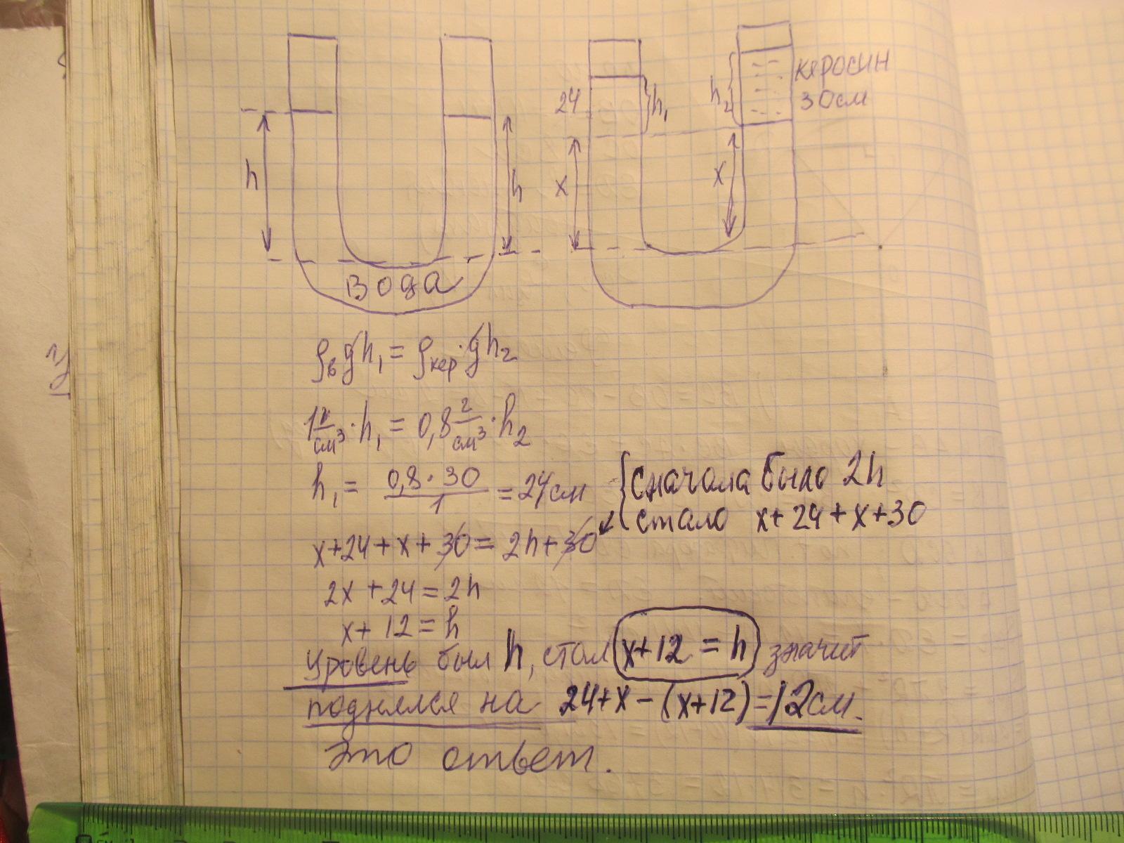 Соотношение указнное на рисунке состоит из один одинаковых турбопроводов заполнены водой .При ожоге керосина на правой стороне высотой 30 см , на сколько увеличивается высота в влевой стороне?
