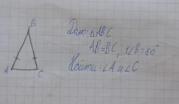 Угол А= углу С т.к. треугольник равнобедренный => угол А = 180-80/2=50=угол С