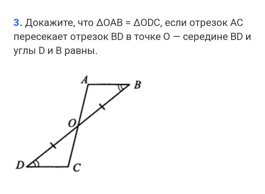 Докажите, что ΔОАВ = ΔОDC, если отрезок АС пересекает отрезок BD в точке О — середине BD и углы D и B равны.