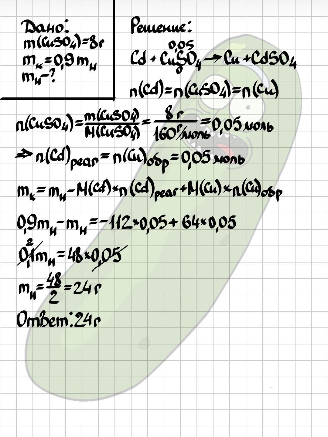 В раствор, содержащий 8 г меди (II) сульфата, поместили кадмиевую пластинку. После полного вытеснения меди масса пластинки уменьшилась на 10%. Определите исходную массу пластины (г)