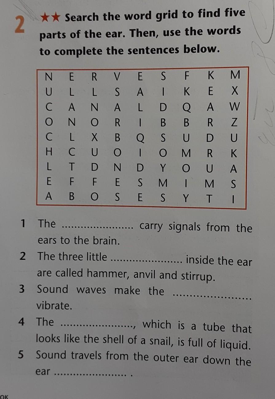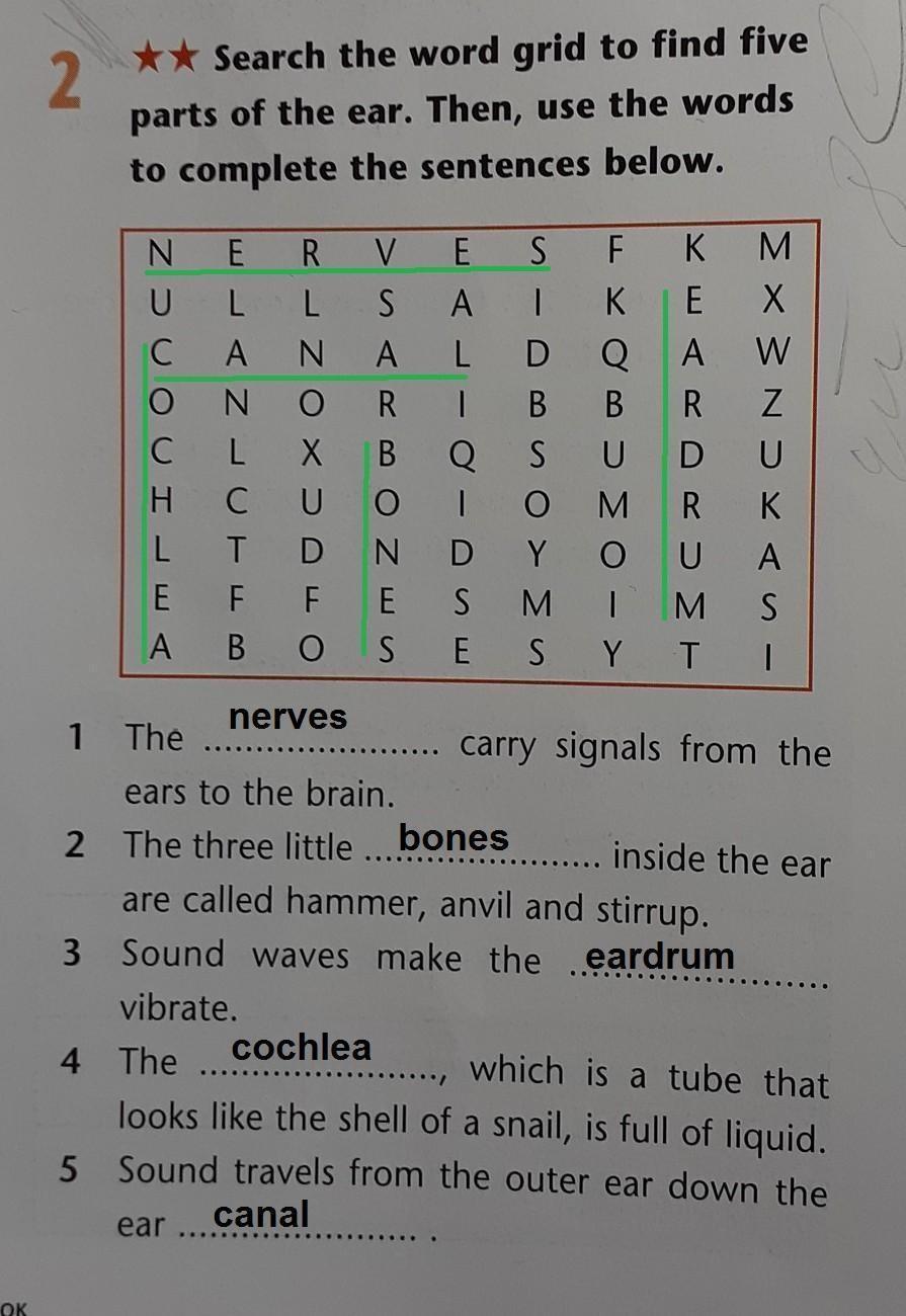 Search the word grid to find five parts of the ear. Then, use the words to complete the sentences below.