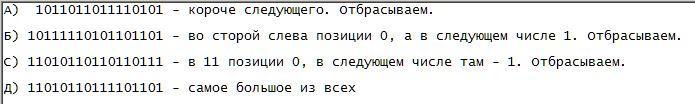 Все четыре числа нужно подписать друг под другом, выповняв по правому краю. Затем просмотреть их слева направо попарно, отыскивая первое несовпадение . В котором будет единица, а в другом ноль - то и больше. Меньшее отбросить и сравнивать с прочими числами. Это показано во вложении.