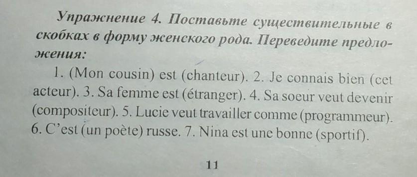 1.Ma cousine est chanteuse .2.je connais bien cette actrise . 3. Sa femme est étrangere 6.C'est une poetesse russe . 7. Nina est une bonne sportive 4.compositrisse (не уверенна) 5.programmatrisse (тоже не уверена ) :)