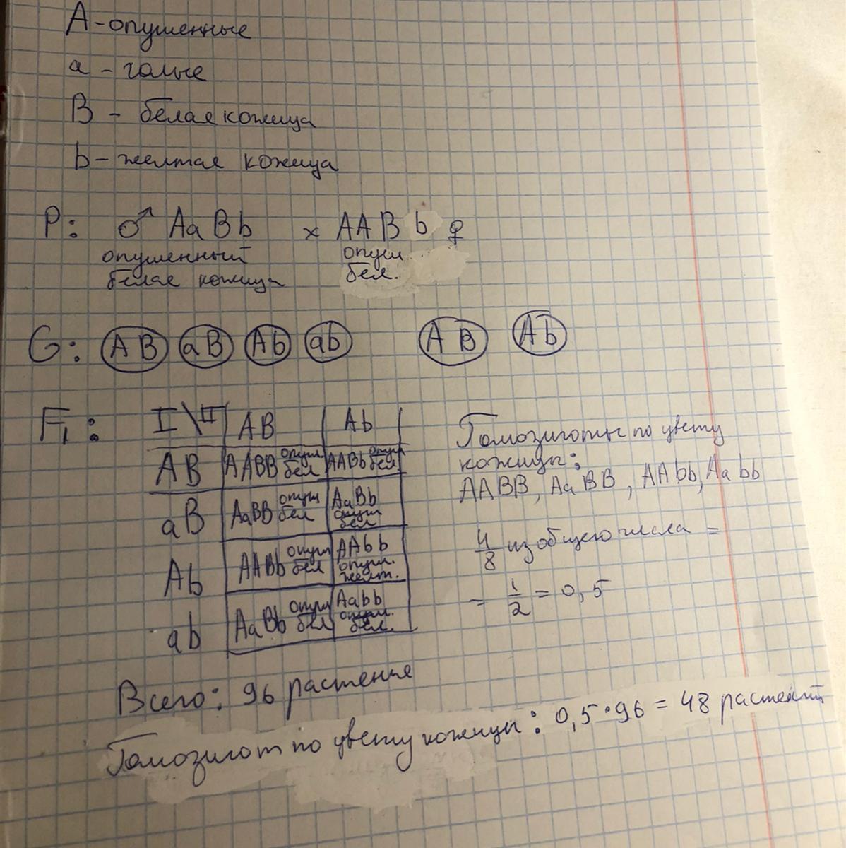 Опушенные персики доминируют над голыми; белая кожица доминирует над желтой. Гетерозиготный по дум признакам персик скрестили с опушенным и белой кожицей персиком. Из полученных 96 растений было получено 75% опушенных, с белой кожицей, а 25% опушенных с желтой кожицей. Сколько из полученных растений будут гомозиготой по цвету кожицы?