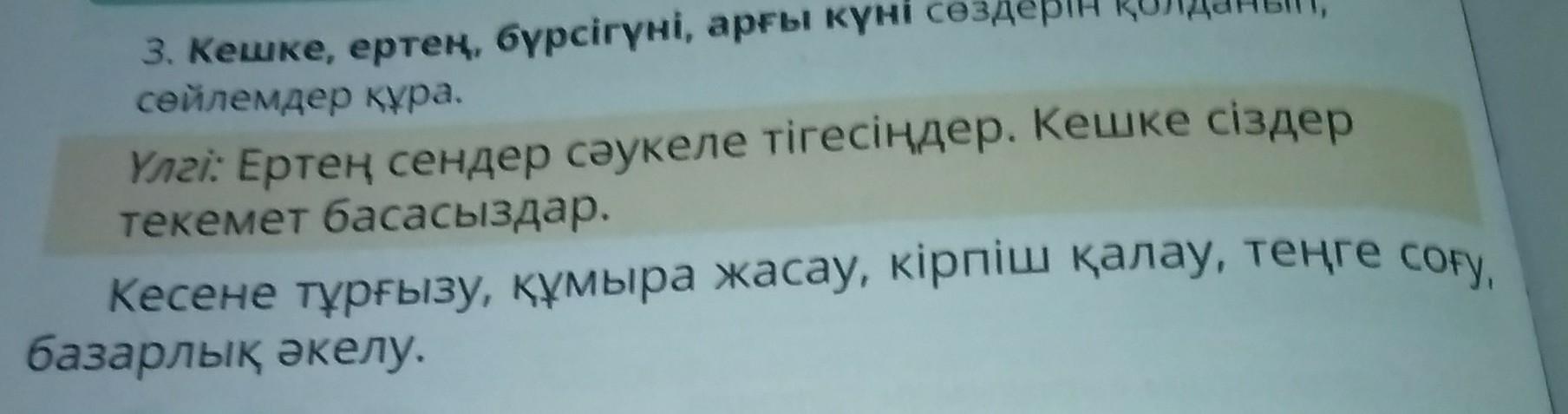 Кешке мен үй жұмысын жасаймын. Ертең бiзде математика сабағы болады. Бүрсiгүнi бiз саябақа барамыз.