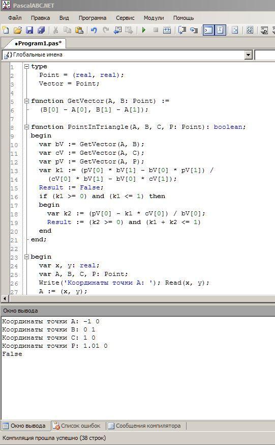 Writeln(PointInTriangle(A, B, C, P));  // True - принадлежит