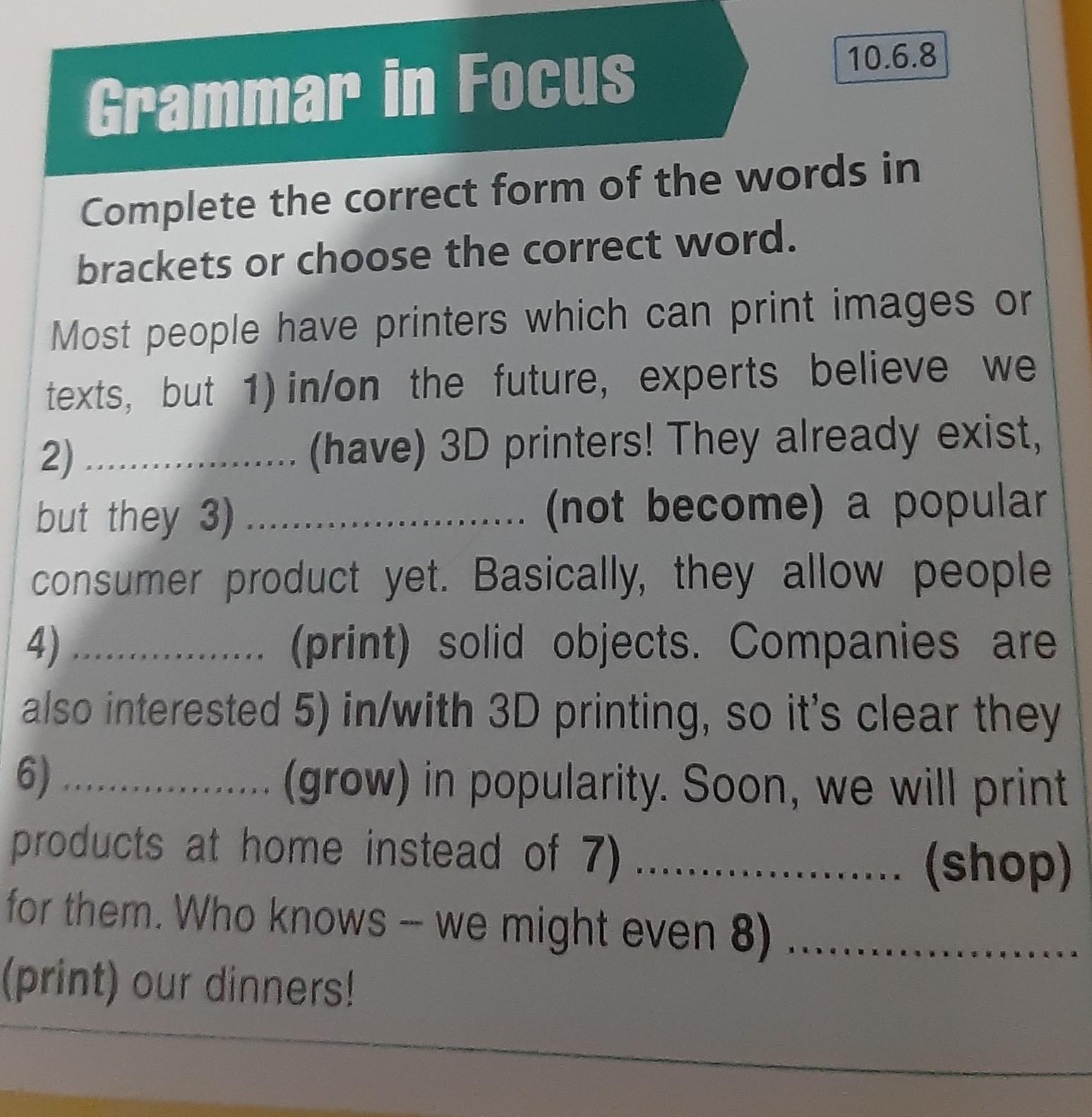 Відповідь:1)In 2)Will have 3) Don't 4)To print 5)In 6)Will grow 7)Shopping 8)Print