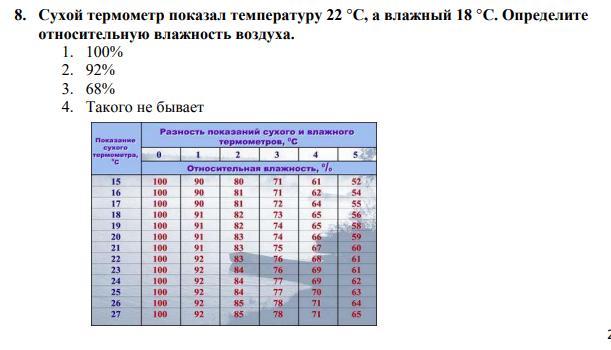 Влажный обычно показывает меньше. Влага испаряется, забирает тепло. Его показания 18 грС. Разность=22-18=4 грС