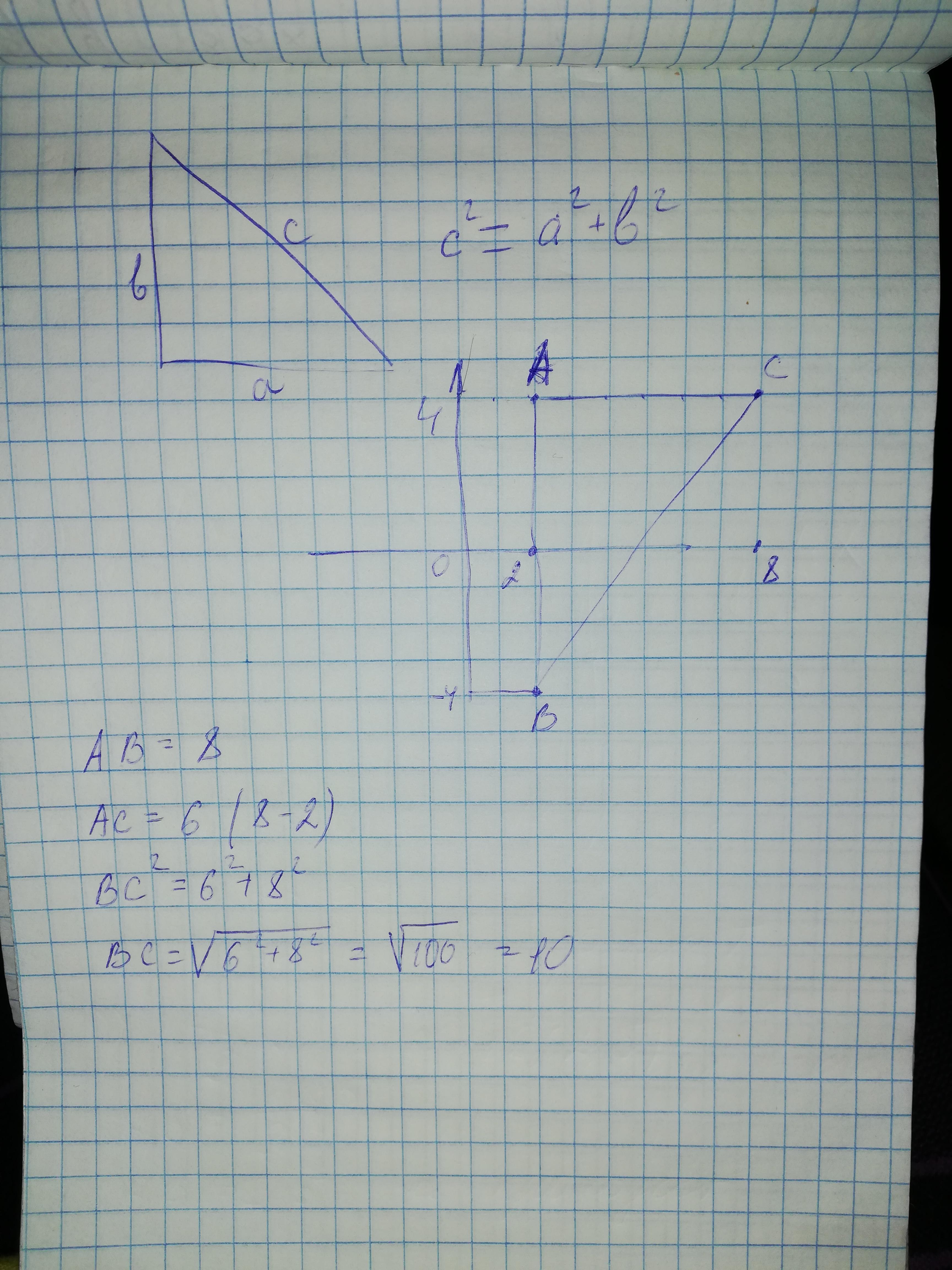 А какой это класс и через чего решение должно быть?Можно по теореме Пифагора вычислить гипотенузы треугольников,найдя второй катет,как середину отрезка от2 до8. ВС=10
