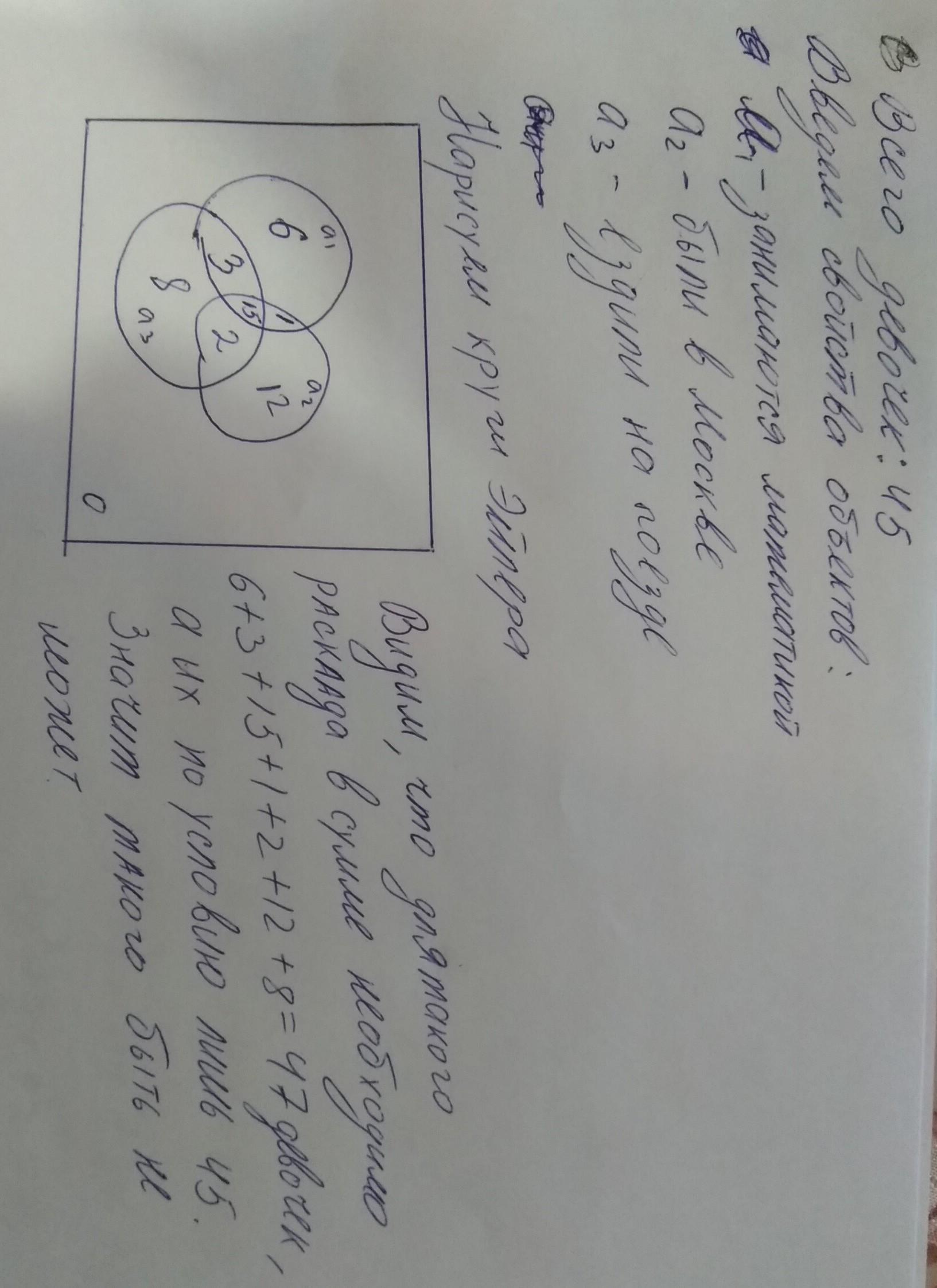 Маша опросила подружек из своего ансмбля и получила следующие ответы: 25 из них занимаются математикой ,30 были в Москве, 28 ездили на поезде. Среди ездивших на поезде 18 занимаются математикой и 17 были в Москве. 16 подружек занимаются математикой и были в Москве, притом среди них 15 ещё и ездили на поезде. При этом в ансамбле всего 45 девочек. Возможно ли это?