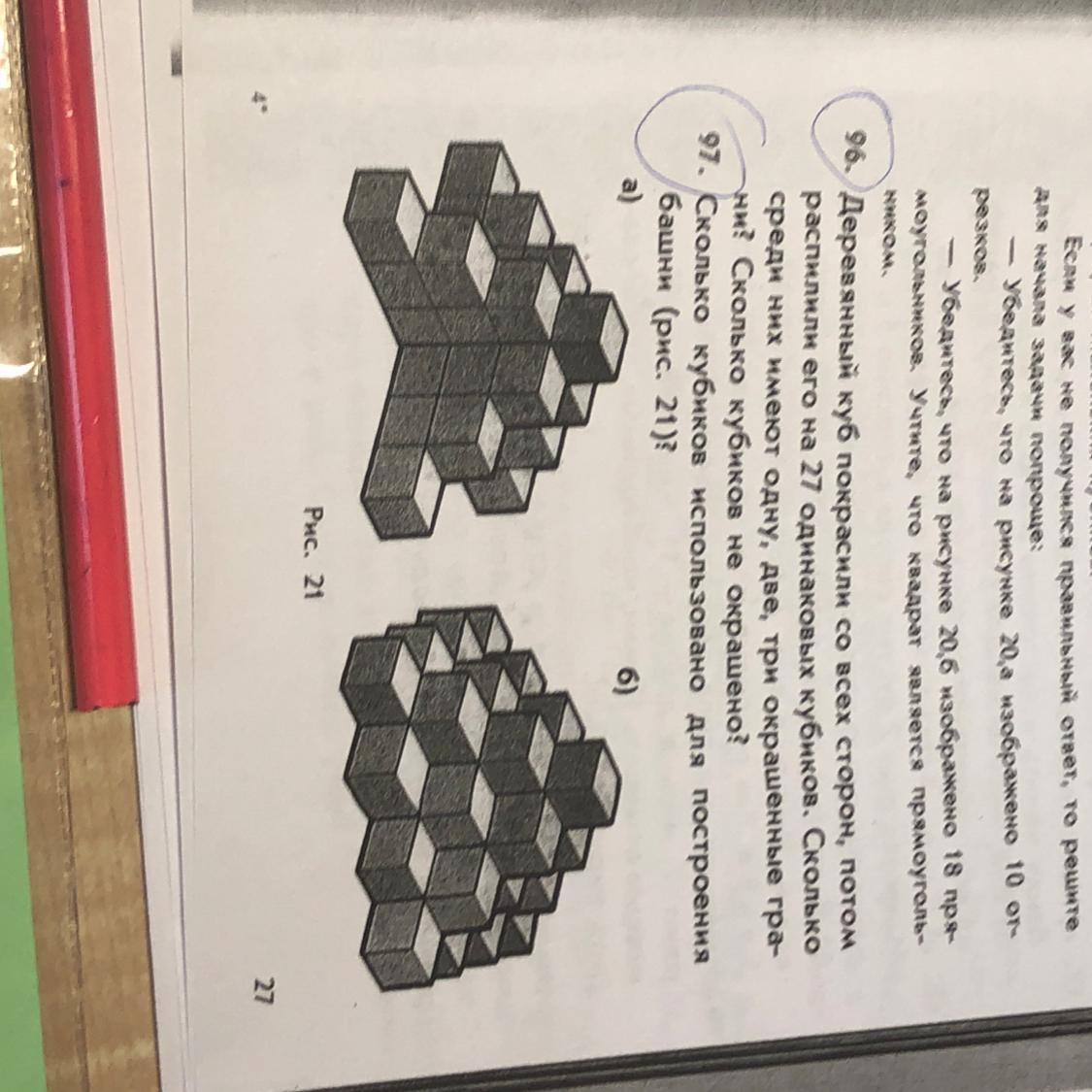 а) В данной фигуре под верхним кубиком лежат еще 3. Эти 4 кубика - ось фигуры. К ней в виде креста подходят 4 одинаковых ребра, каждое из которых состоит из 6 кубиков. Их легко сосчитать: они хорошо видны.