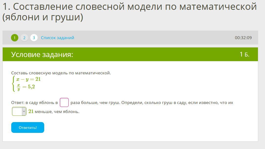 В саду яблонь в 5,2 раза больше чем груш . Определи, сколько груш в саду, если известно, что их на 21 меньше чем яблонь .