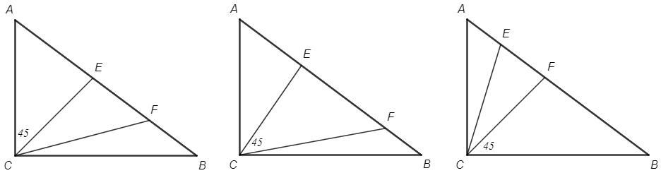 В прямоугольном треугольнике ABC на гипотенузе AB отмечнны точки E и F так, что точка Е лежит между точками A и F. Отрезки CE и CF разбивают угол C на три угла ACE, ECF, FCB, один из которых равен разности двух других. Найдите градусную меру наибольшего из углов ACE, ECF, FCB. Можно ли определить, какой именно из этих углов больше?
