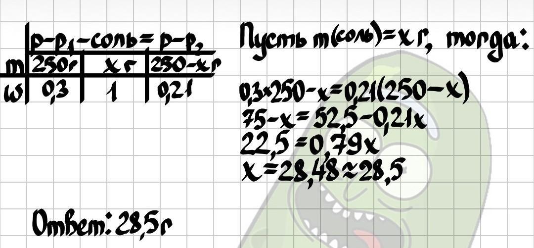 Горячий раствор 250 г с массовой долей соли 30% охладили. В результате выпал кристаллический осадок, не содержащий воды и остался бесцветный раствор. Найдите количество выпавшей в осадок соли (в г), если массовая доля соли в оставшемся растворе стала 21%.