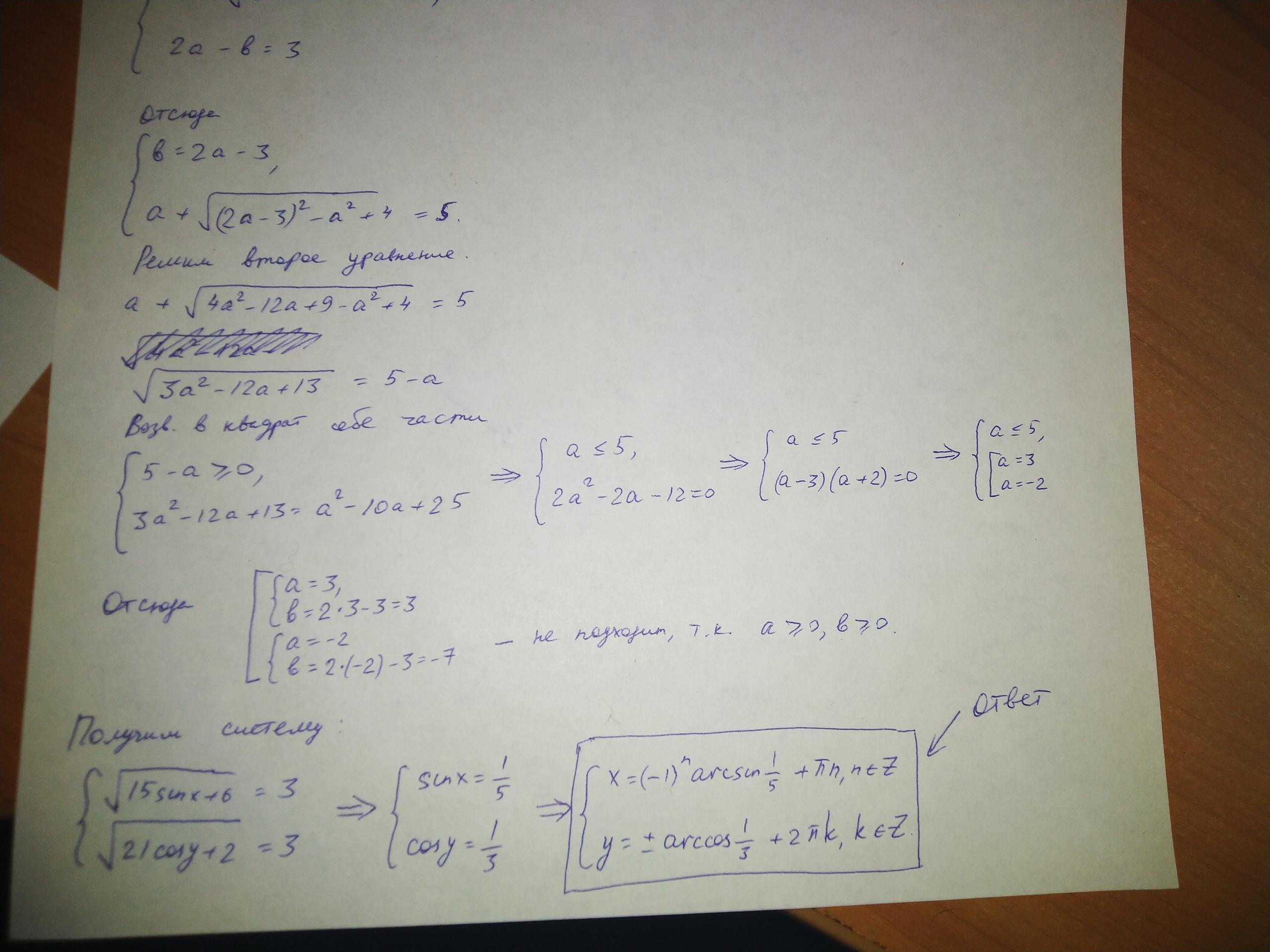 (15 sinx+6) ^0,5 + (21cosу - 15 sin x) ^0,5= 5