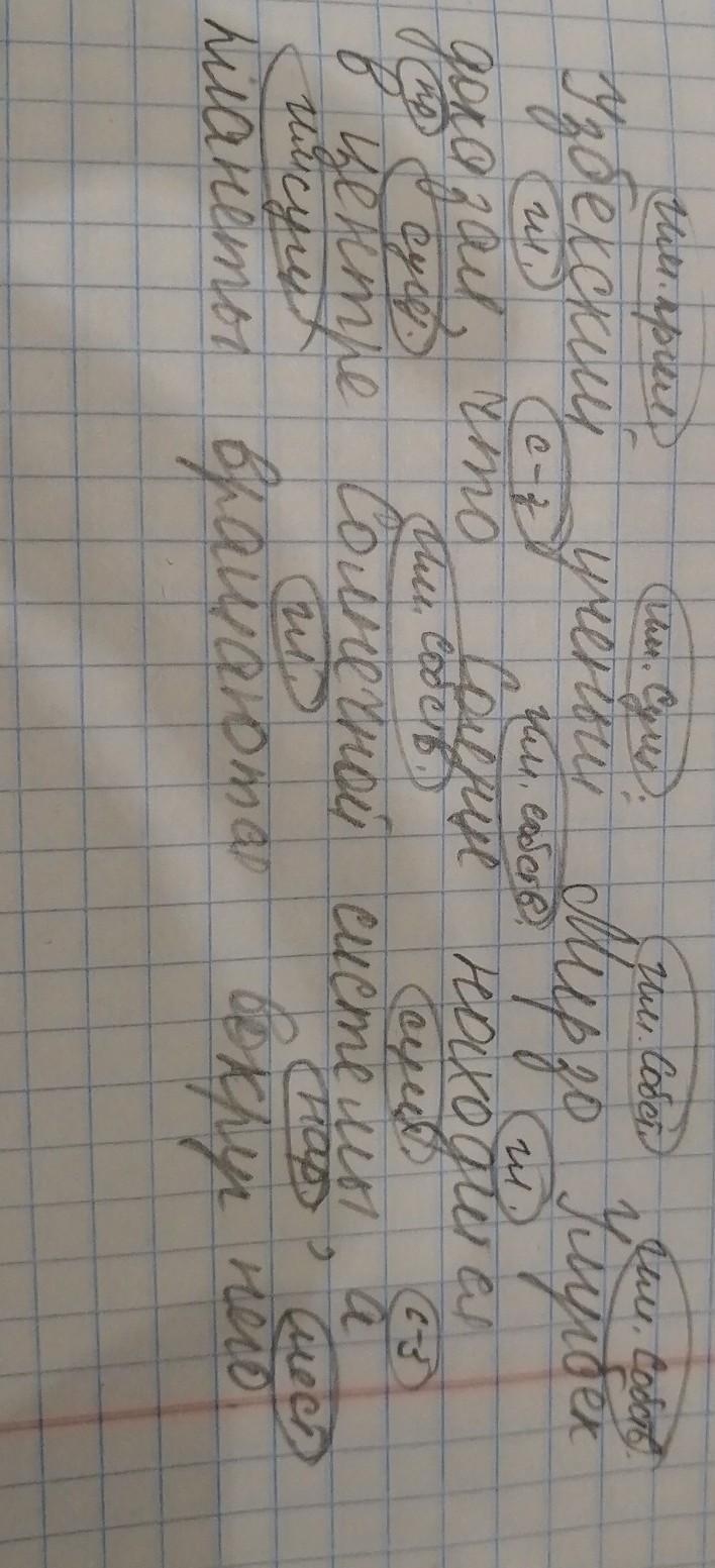Узбекский ученый Мирзо Улугбек доказал,что Солнце находится в центре Солнечной системы,а планеты вращаются вокруг него-разобрать предложение по частям речи