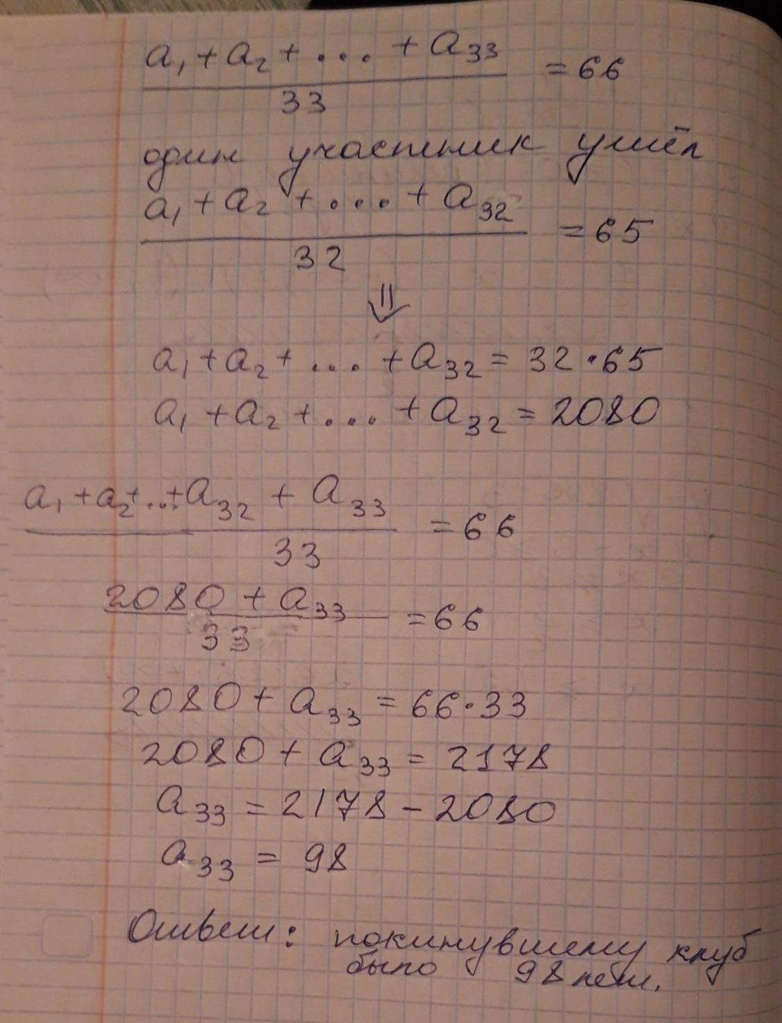 1)В клуб любителей мини-пинок вступил 33 участника. Их средний возраст составил 66 лет. Когда одному из любителей по некоторым обстоятельствам пришлось покинуть клуб, средний возраст участников составил 65 лет. Сколько лет было любителю, покинувшему клуб?