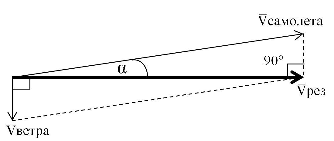 А результирующий он вследствие сложения вектора скорость ветра и вектора скорости самолета.