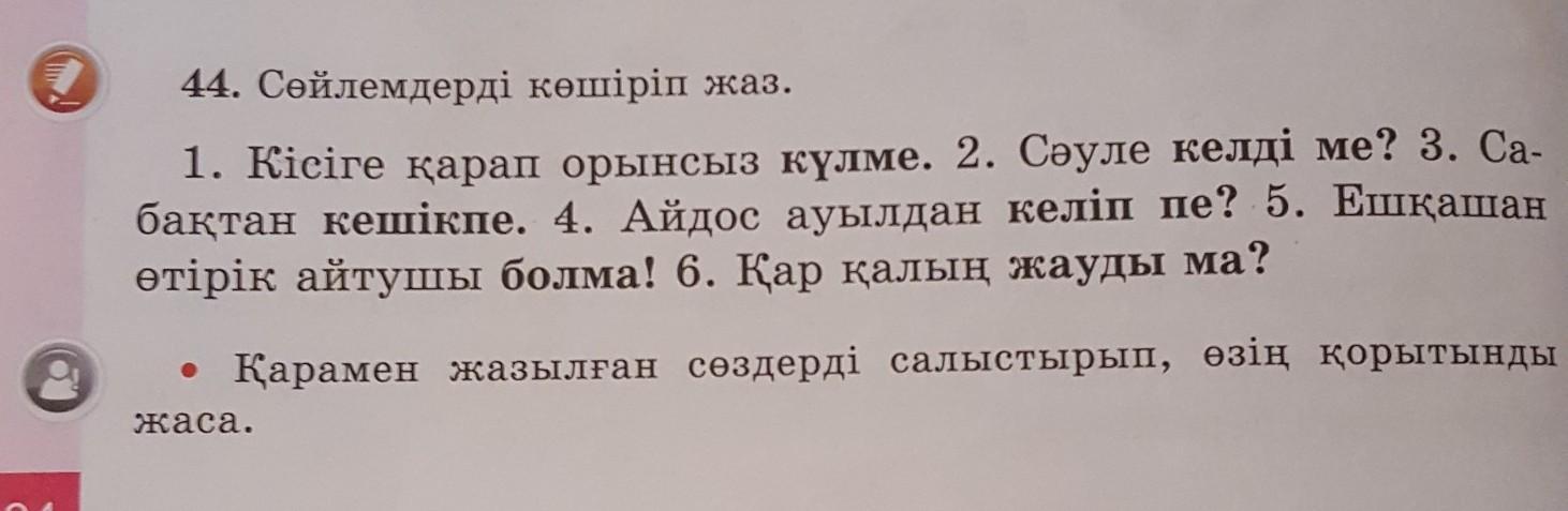 1. Кісіге қарап орынсыз күлме. 2. Сәуле келді ме? 3. Са-