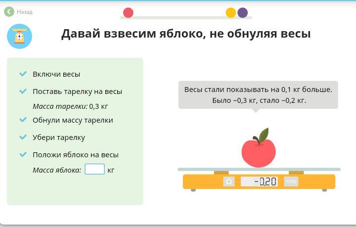 Т.к. мы обнулили весы и убрали тарелку, весы начали показывать -0,3 кг, а когда яблоко - -0,2кг, следовательно прибавилось 0,1 кг, значит яблоко весит 0,1 кг.