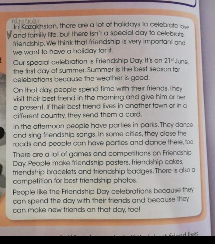 В Казахстане много праздников для празднования любви и семейной жизни, но нет особого дня для празднования дружбы. Мы считаем, что дружба очень важна, и мы хотим, чтобы у нее был праздник. Наш особый праздник - День дружбы. 21 июня - первый день лета. Лето - лучшее время для праздников, потому что погода хорошая. В этот день люди проводят время со своими друзьями. Утром они навещают своего лучшего друга и дарят ему или ей подарок. Если их лучший друг живет в другом городе или в другой стране, они посылают им открытку. Во второй половине дня люди устраивают вечеринки в парках. Они поют и поют песни дружбы. В некоторых городах они закрывают дороги, и люди могут устраивать вечеринки и Там тоже танцуют. В День дружбы проводится множество игр и конкурсов. Люди делают плакаты о дружбе, торты о дружбе, браслеты о дружбе и значки дружбы. Также проводится конкурс на лучшие фотографии дружбы. Людям нравятся празднования Дня дружбы, потому что они могут провести день со своими друзьями и потому что они могут завести новых друзей в этот день тоже!