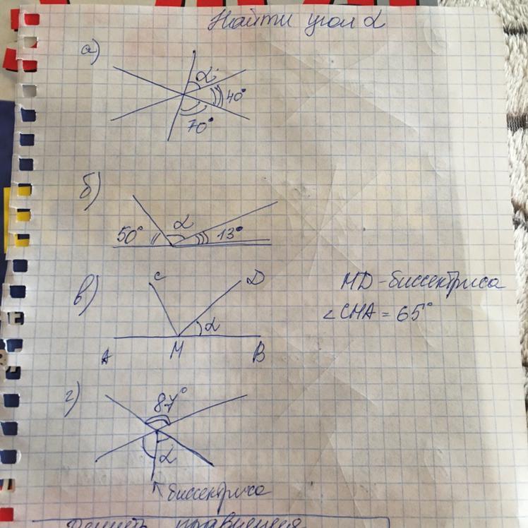 Эти углы вертикальные (вроде бы), значит, где проведена биссектриса, этот угол равен 87 градусам. Так как биссектриса делит угол пополам, мы 87/2 и получаем 43,5.