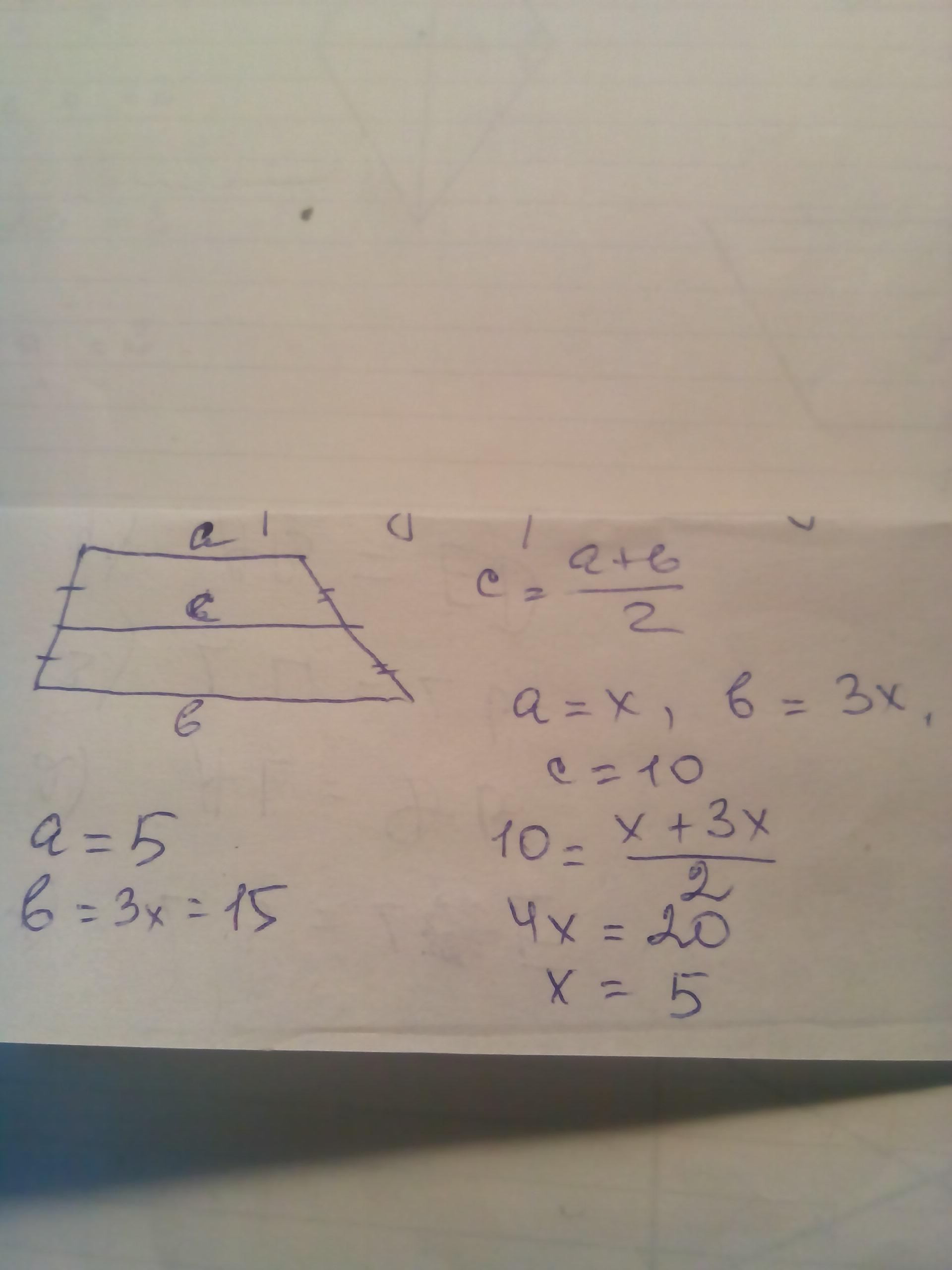 середня лінія трапеції дорівнює 10 см. знайдіть більшу основу трапеції якщо один з основ трапеції в 3 рази більша від другої