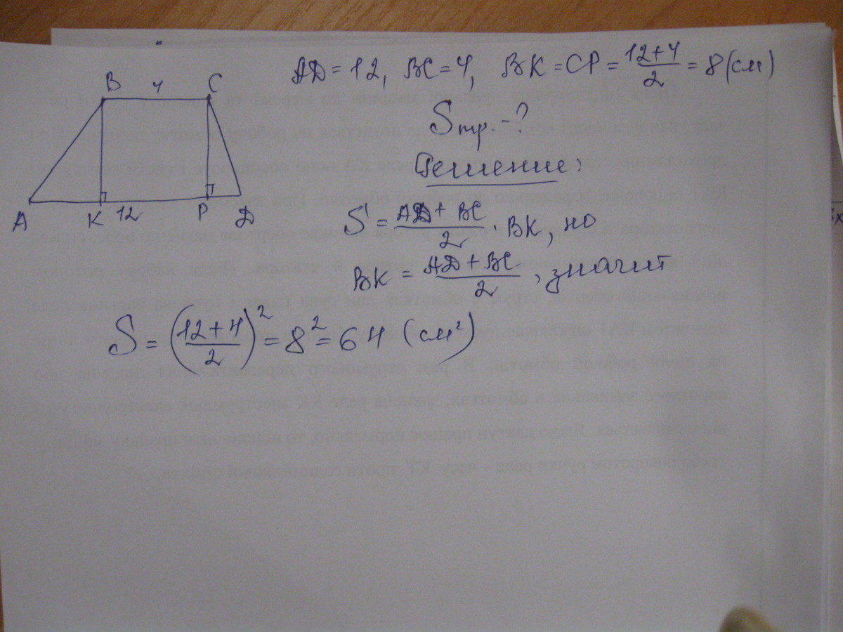 в трапеции основания равны 4см и 12см , а высота равна полусумме длин оснований.найдите площадь трапеции ЕСЛИ МОЖНО ПЛИЗ С РИСУНКОМ!!!