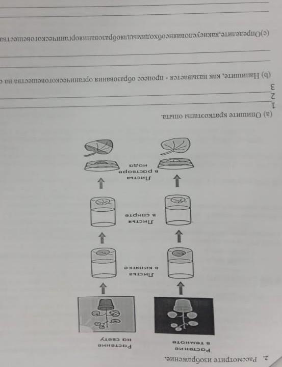 Одно растение помещаем в тёмное место, через несколько суток срезам с него лист , помещаем в кипяток, затем в спирт,лист обесцветился, капнув йодом, видим, что лист не меняет окраски.