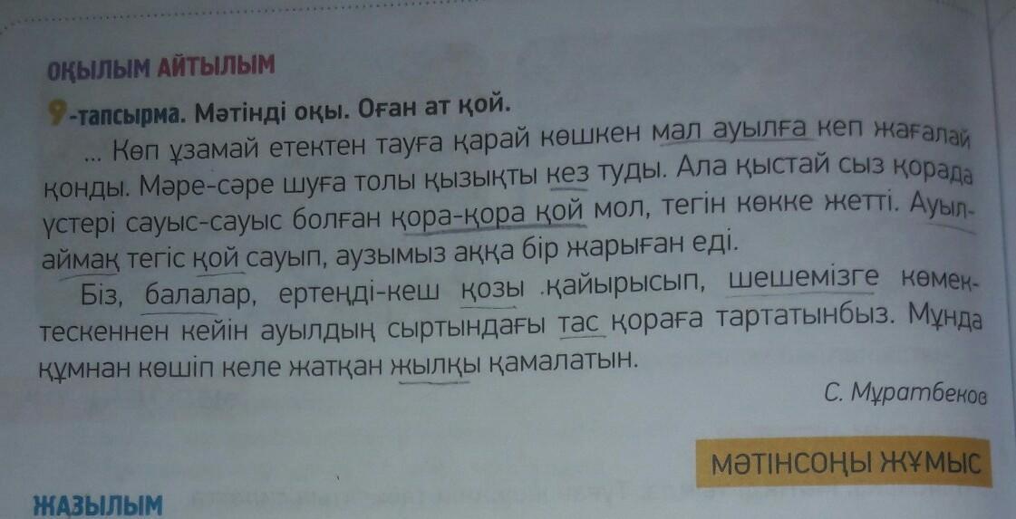 4.Қорытынды:Бұл мәтінде ауыл өмірі айтылған,аналарымыздың жұмысы да қалыс қалмады,жас балдар дың кешке өрістен кейін қайда баратынын жазылған.