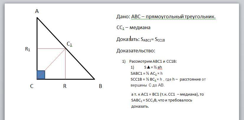 Медиана прямоугольного треугольника, проведенная к гипотенузе, разбивает его на два треугольника. Докажите, что площади этих треугольников равны.