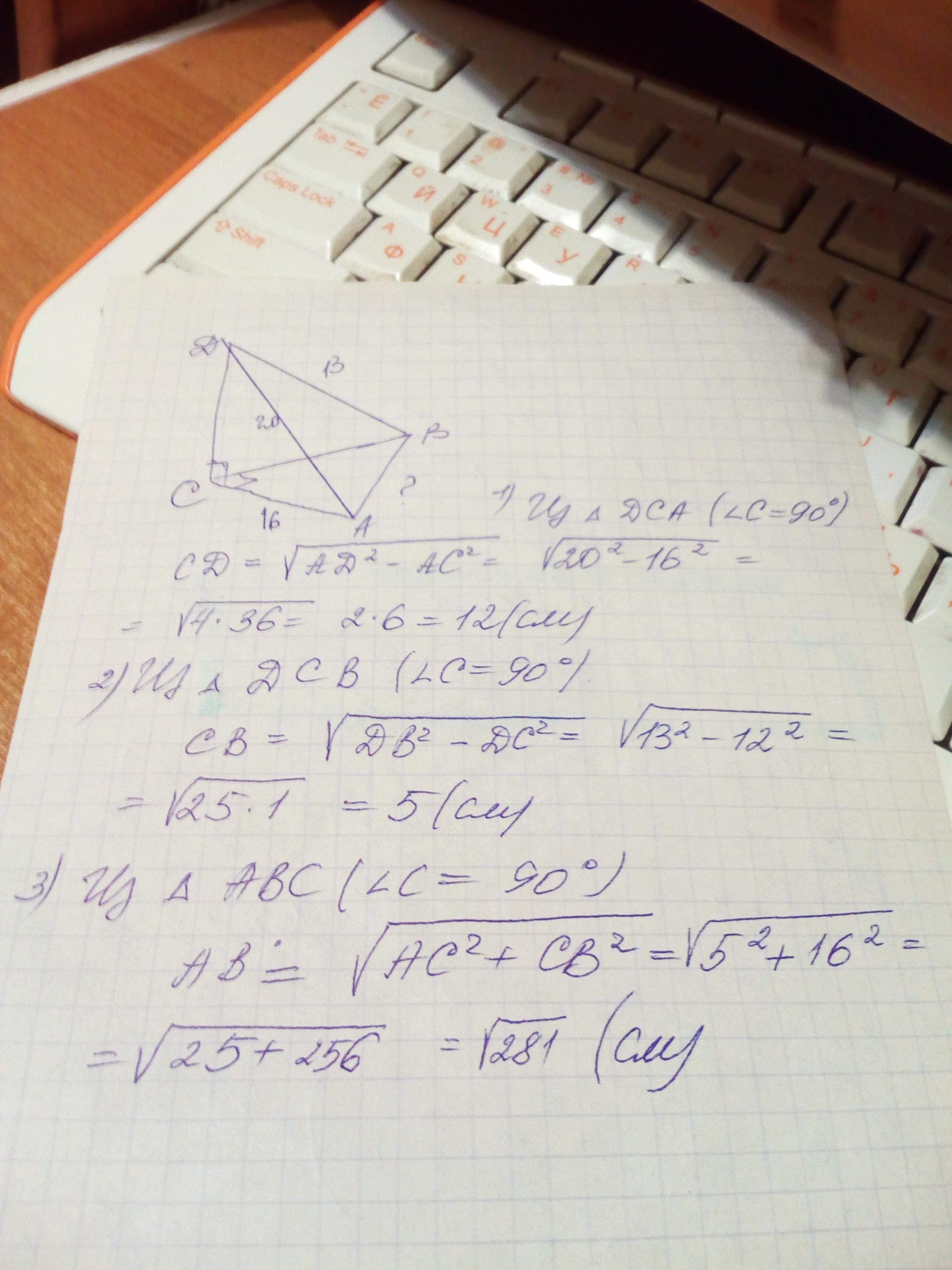 через вершину прямого угла с прямоугольного треугольника абс к его плоскости проведен перпендикуляр сд. найдите длину стороны аб треугольника абс если ад =20 см, вд=13 см, ас=16 см