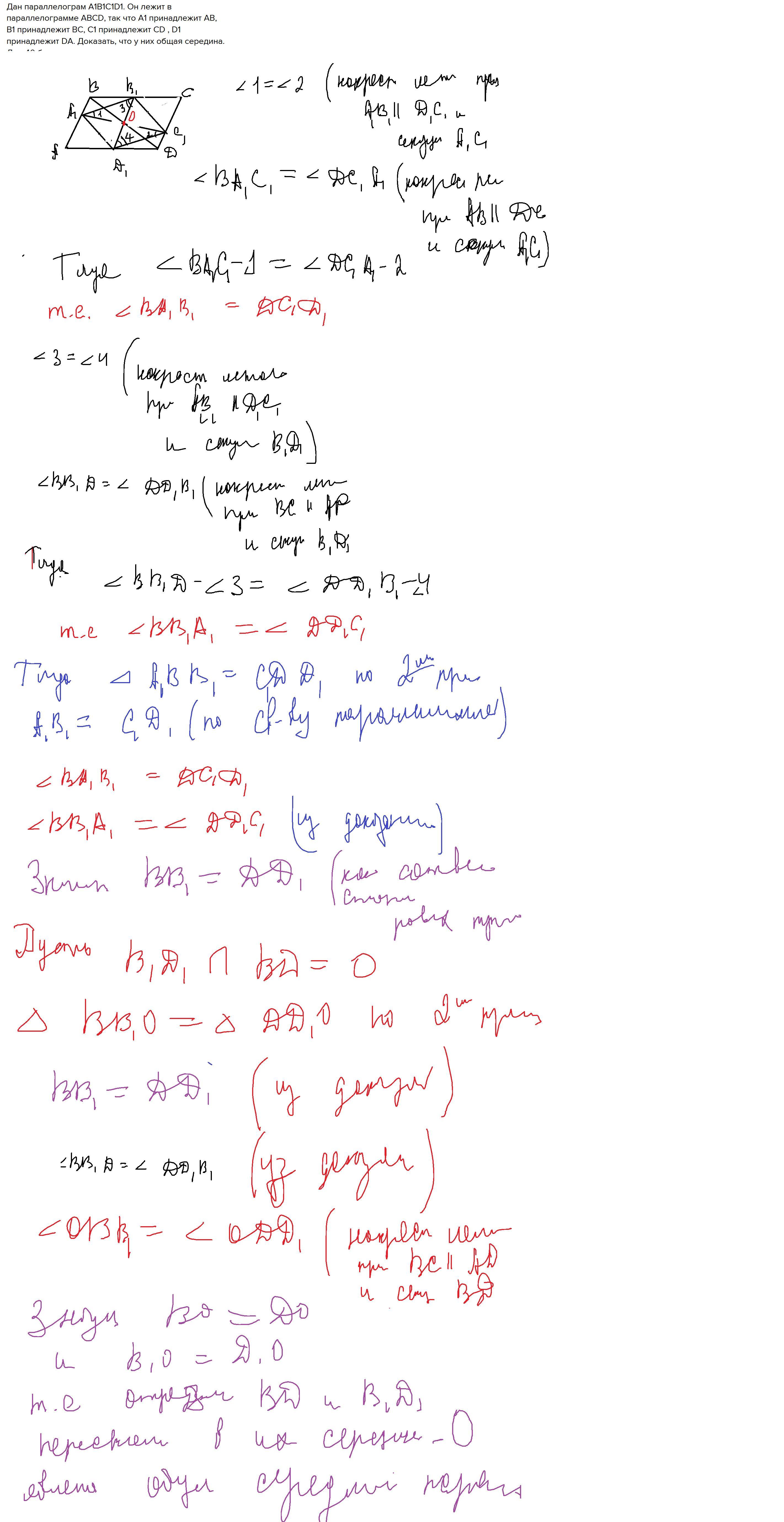 Дан параллелограм A1B1C1D1. Он лежит в параллелограмме ABCD, так что A1 принадлежит AB, B1 принадлежит BC, С1 принадлежит CD , D1 принадлежит DA. Доказать, что у них общая середина. Дам 40 баллов