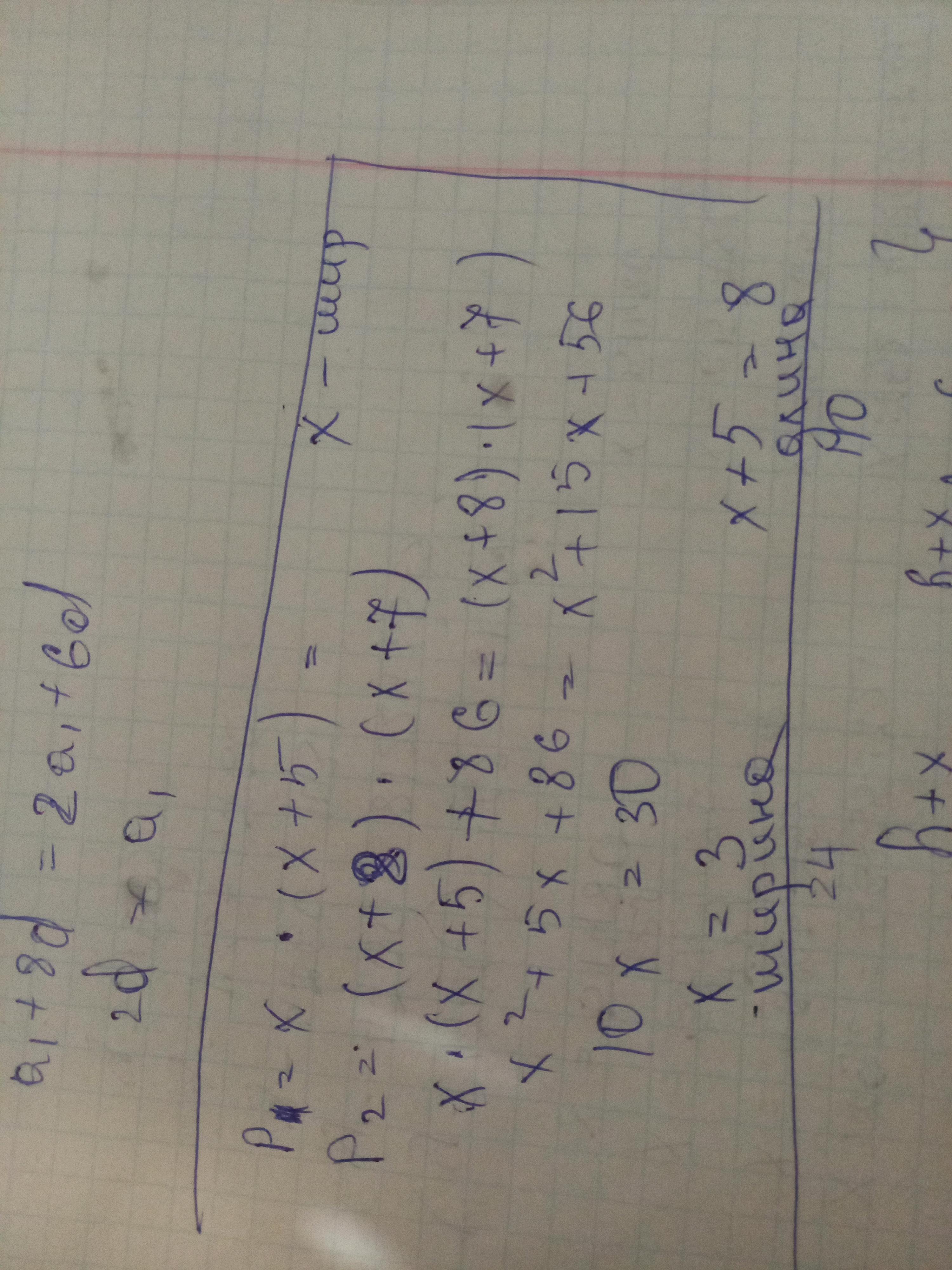 Ответ:пусть x ширина тогда x+5 длина. x+7 ширина x+8 длина