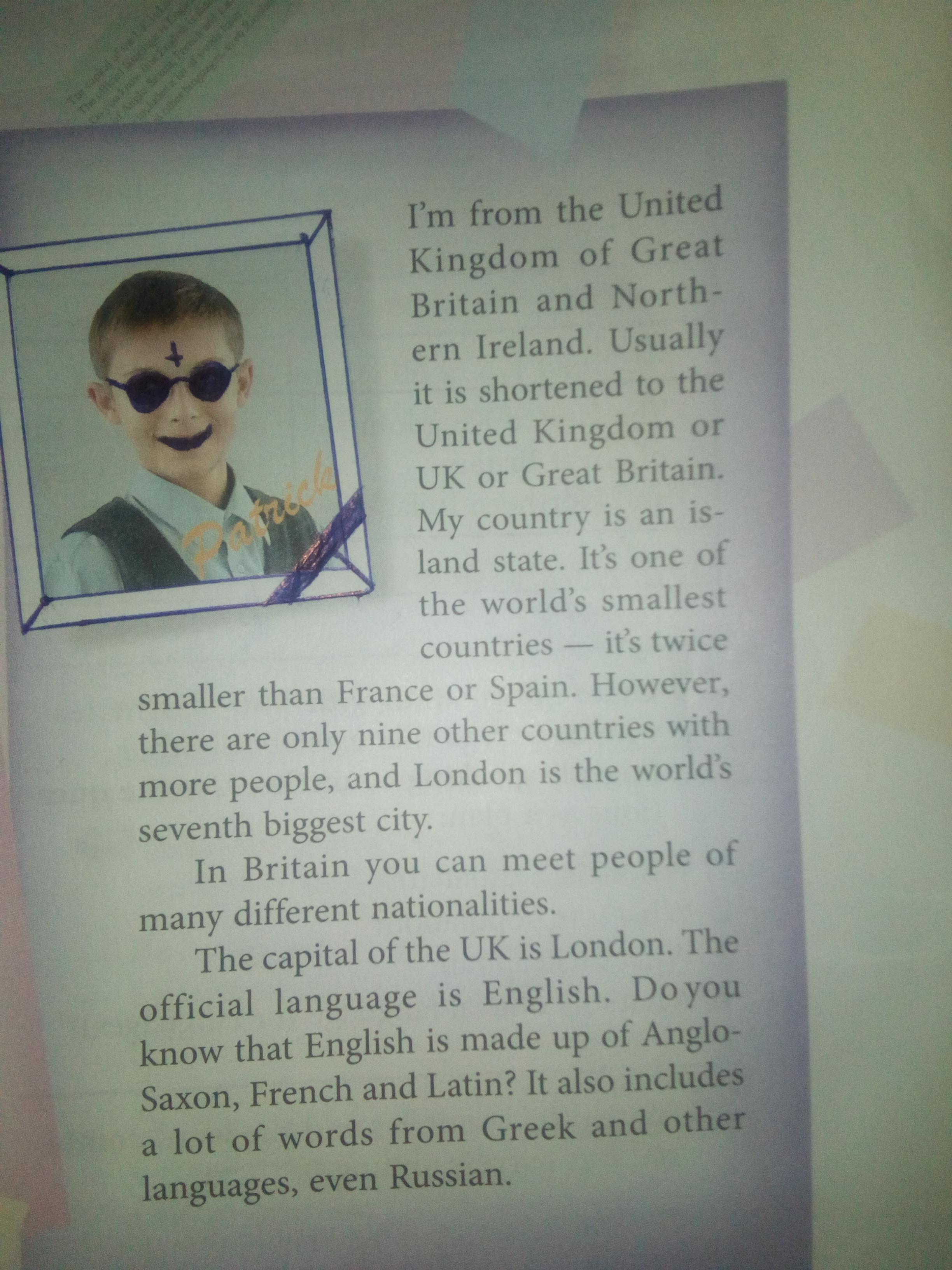 айм фром зе юнайтед киндом оф греат британ энд норзлан айрланд. Южуали ит ис шортенед то зе юнайтед киндом ор юкэй оф греат британ Май кантри ис анимланд стате . Ит им оне оф зе ворлдс смаллест кантриес итс твайс смаллер зен франсе ор спэин. Ховевер зере а онли найн озерсоунтриес виз море пипл,, энд лондон севенс биггест сити. Ин британ ю кэн миитпипл оф мэни дифферент националиес. Зе капитал оф зе юкей ин Лондон . Зе офишал лэндвич ис инглиш. До у ноу зат инглиш ис мейд ап оф англо саксон, френч энд латин? ит олсо инкладс а лот оф ворлдс фром грик энд ланджуадже евен рашиан