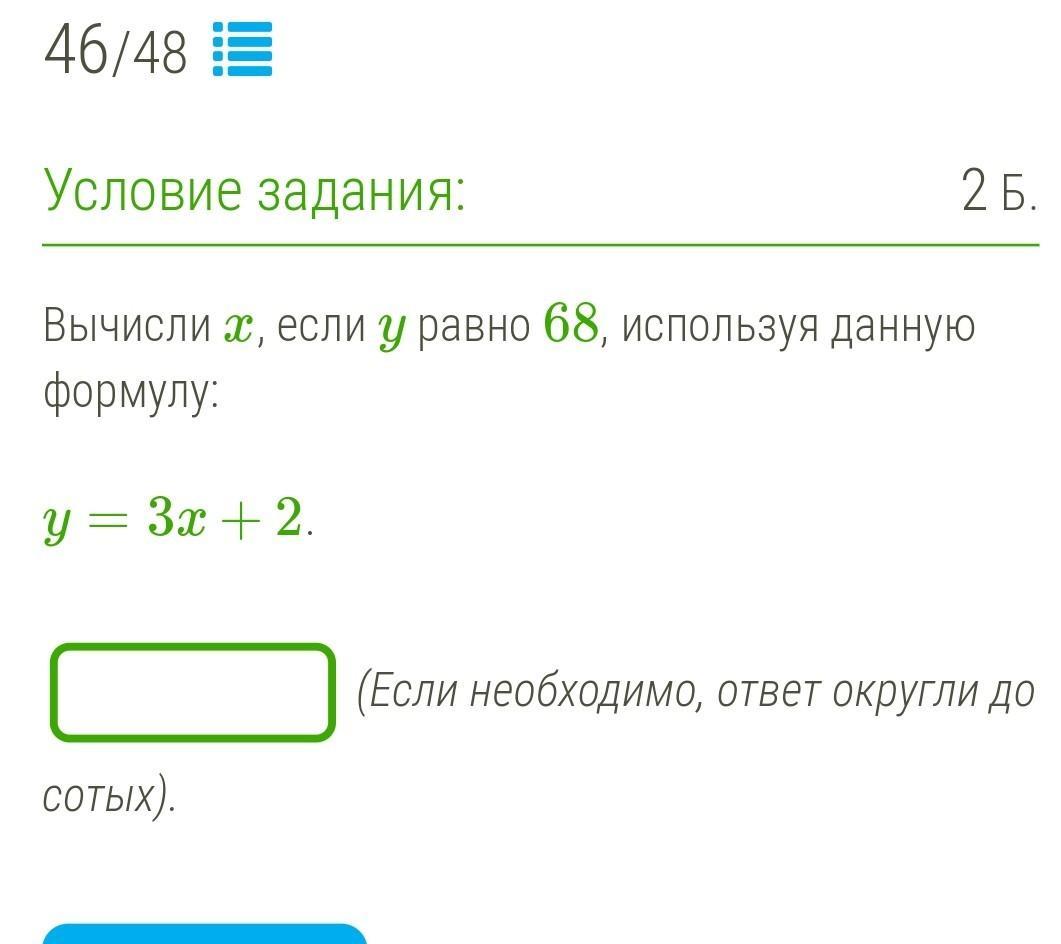 Подставим данные в формулу. 68=3х+2. 3х=68-2. 3х=66. х=66/3. х=22